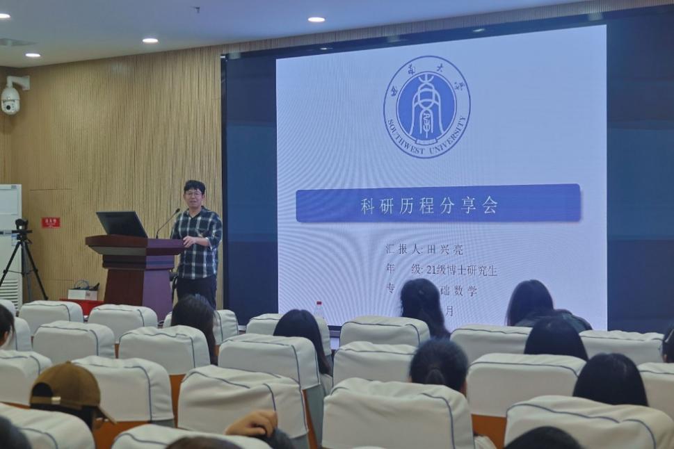 会议伊始,田兴亮介绍了其研究方向——带权不等式领域的前沿探索,包括 Lp-CKN 型不等式余项估计、二阶 CKN 型不等式函数对称破缺性及对称性研究。结合自身科研经历,他从三方面给出建议:首先是打好基础,通过专业课、学术讨论课筑牢知识体系,精读本方向经典著作及高质量期刊论文,在积累中培养学术逻辑与写作规范;其次是推陈出新,从"小创新"起步,在熟悉写作之后尝试解决优秀论文中的公开猜想,通过调整研究条件寻求突破,在已有成果基础上开拓新视角;最后是重视写作,田兴亮指出学术论文需要讲好一个完整的故事,在完成初稿后要反复打磨以增强可读性,同门之间可以交叉审读以避免常识性错误。他同时提醒同学们尽早明确目标,做好职业生涯规划,在就业与科研道路间提前思考并做好计划安排。