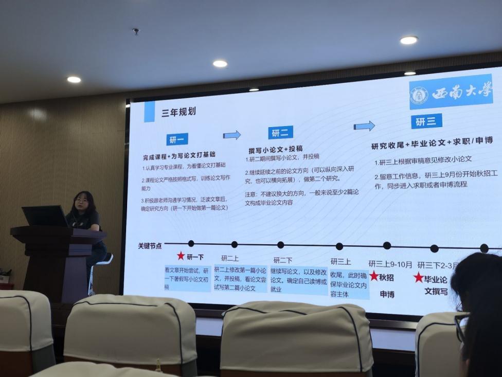 随后,邱鑫从规划、科研、发展三方面展开分享。对于研究生三年的时间规划,邱鑫建议:研一阶段以课程学习和基础知识储备为核心任务,在春季学期结束前明确研究方向;研二重点进行学术论文撰写与发表工作;研三同步推进毕业论文撰写与职业发展规划。邱鑫特别指出,确定研究方向(研一下)和求职申博准备期(研三上)是该规划体系的关键节点。谈及科研经验,邱鑫强调了文献研读的系统性,建议选择本领域10―15篇高质量论文进行深度解析,重点关注研究方法和论证逻辑。对于论文写作,她提出"核心突破法"——优先完成关键证明环节的推导与验证,再进行全文框架梳理,以此提升完成效率,并提醒同学们定期与导师保持沟通,协同解决研究难题。邱鑫强调,无论是就业还是申博,都一定要提前完成公司、导师等制定的任务,为未来的安排留出充分的准备时间。
