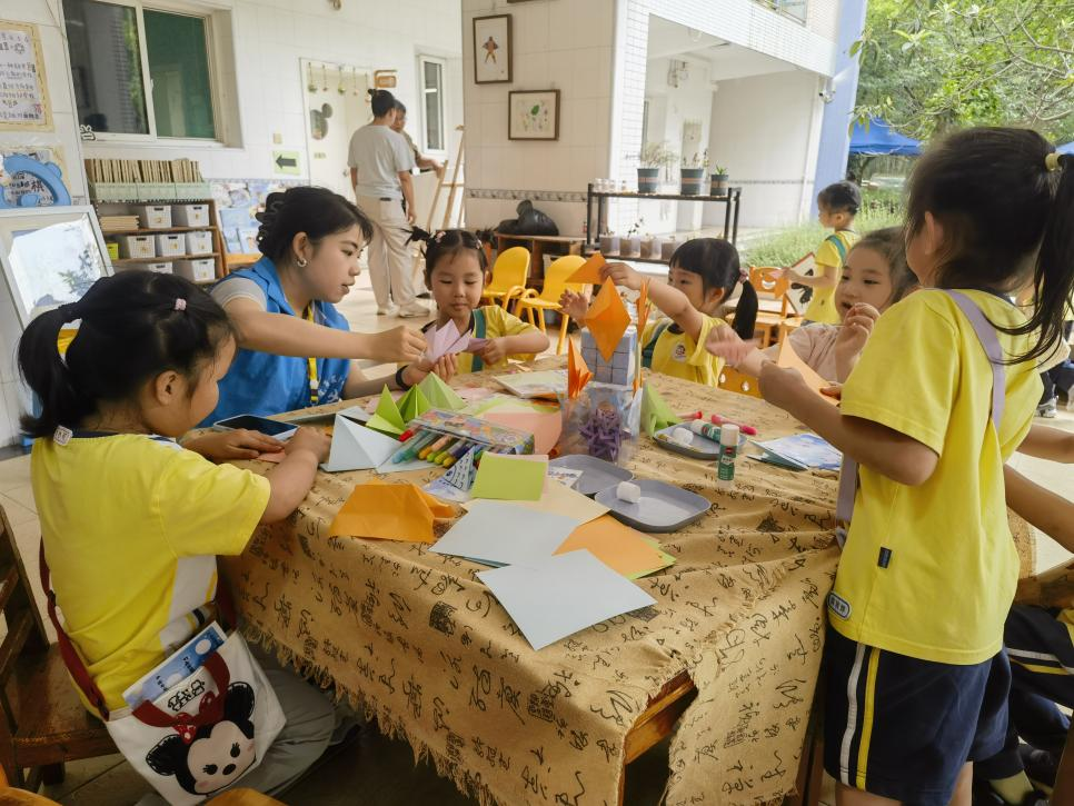中班的折纸课堂同样精彩纷呈。志愿者们以“小鱼”折纸为主题,引导孩子们先完成折纸步骤,再用彩笔绘制鱼鳞图案。在折纸过程中,孩子们全神贯注,努力将纸张按照要求折叠,遇到困难时,会主动举手向志愿者求助。志愿者们则手把手地给予指导,帮助孩子们解决问题。当一条条栩栩如生的“小鱼”诞生后,孩子们兴奋地向同伴展示自己的作品,有的小朋友还即兴编起了小鱼的故事,充分展现出他们丰富的想象力和创造力。这种将动手能力与艺术表现相结合的教学方式,让孩子们在实践中得到了多方面的锻炼。