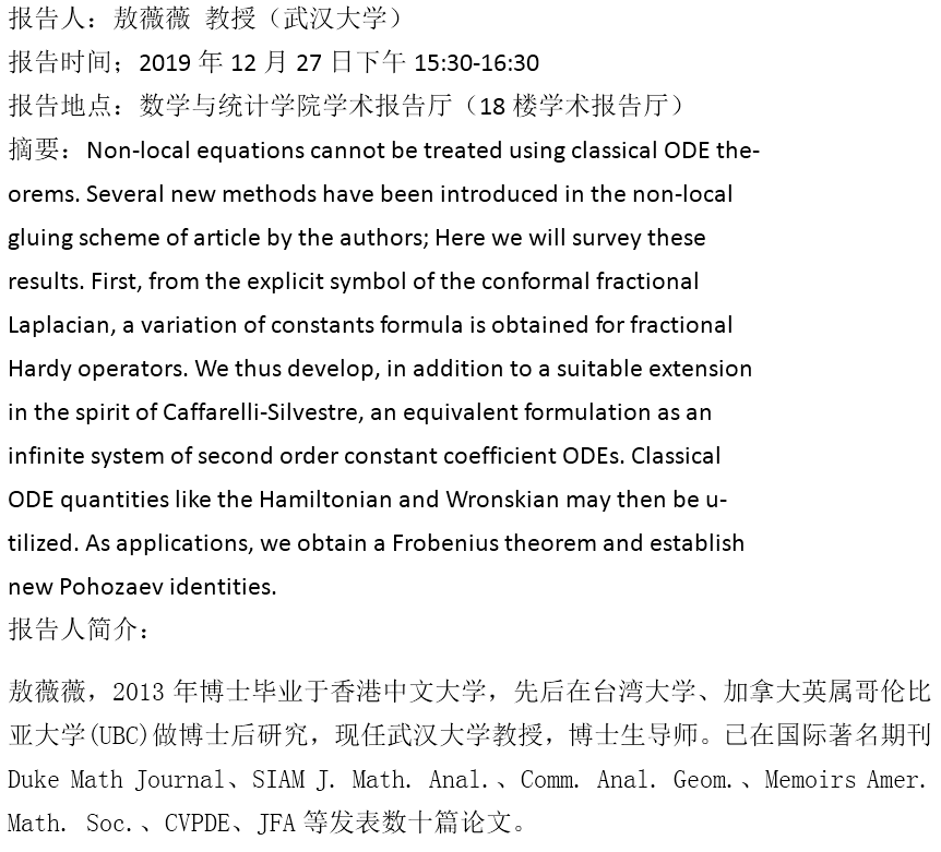 报告人简介: 杨军,教授,博士生导师,2007年获得香港中文大学数学哲学博士学位,访问过多个国际著名数学研究中心,主持国家自然科学基金青年项目和面上项目等多个国家课题。主要研究方向是非线性偏微分方程和非线性分析,在多个国际高水平学术期刊上发表论文,如:Geometric and Functional Analysis、Transactions of the American Mathematical Society、Indiana University Mathematical Journal、Communications in Partial Differential Equations、SIAM Journal on Mathematical Analysis等。