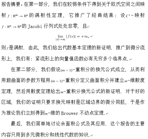 报告题目:欧氏空间之间的满射, 重积分换元公式和Brouwer不动点定理