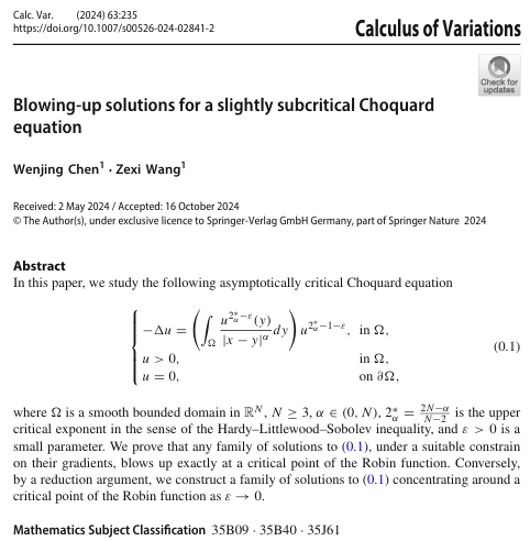 近日,公司博士研究生王泽玺与其导师陈文晶教授合作的论文“Blowing-up solutions for a slightly subcritical Choquard equation”在国际著名期刊《Calculus of Variations and Partial Differential Equations》上发表,bevictor1946韦德官网为第一完成单位。