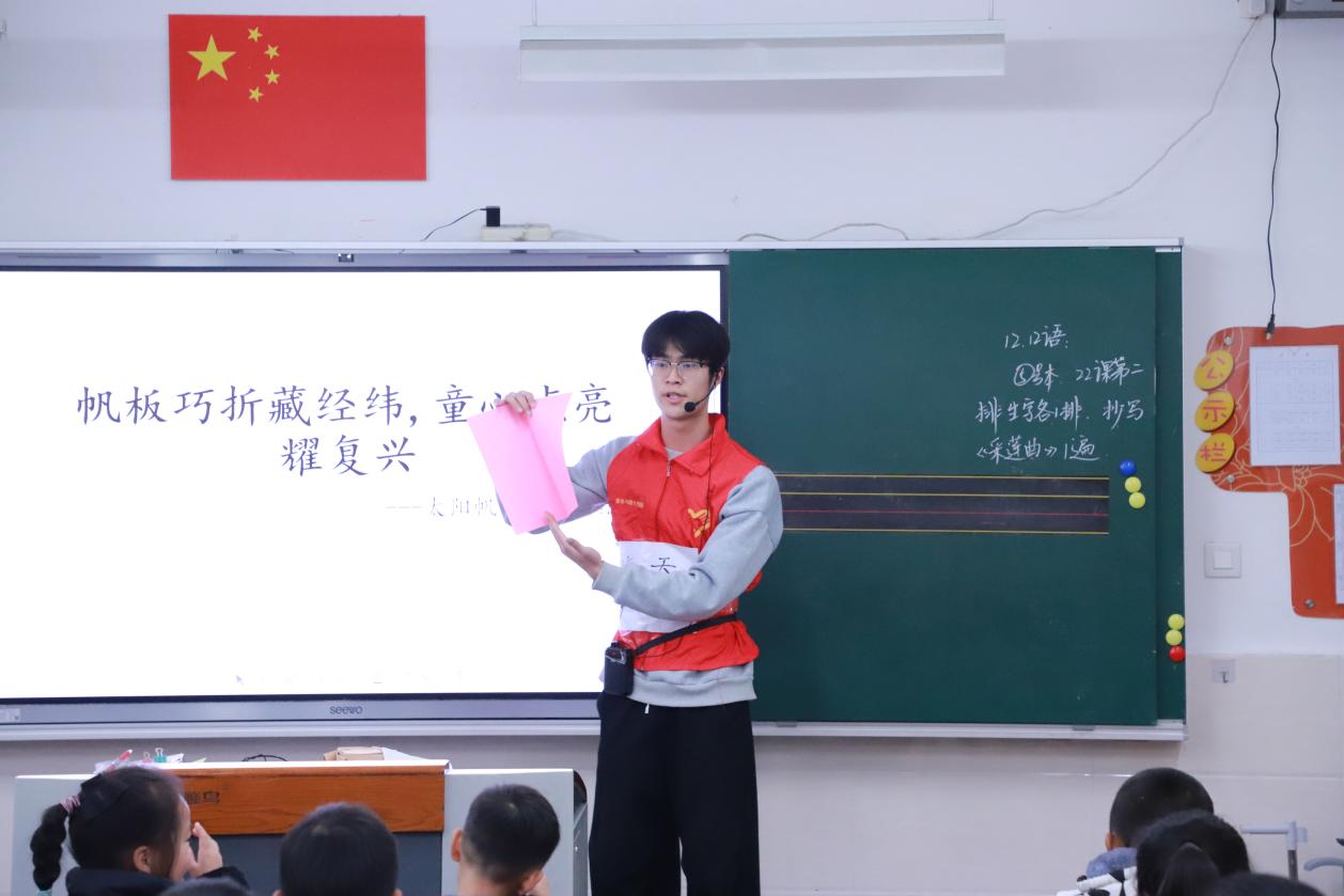 课堂从一则太空故事开始:“宇航员的太阳能帆板损坏了,我们能否用一张纸帮助他?”志愿者以“太阳能帆板”为线索,逐步讲解折纸的基本技法——山折、谷折,并引入应用于航天领域的“三浦折叠法”。随着纸张在手中翻飞,简单的折痕渐渐演变为立体结构,志愿者顺势展开讲述:这类折叠原理如何应用于北斗卫星的太阳能板、航天器的展开机构,甚至未来太空探索。“我们想让孩子们知道,折纸不止是手工,它背后有数学、有工程,更连接着国家科技发展的脉搏。”一位志愿者说。