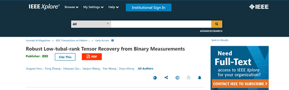 近日,公司王建军教授团队在人工智能领域——高维数据挖掘与机器学习方面再次取得突破性进展,以“Robust Low-tubal-rank Tensor Recovery from Binary Measurements(基于二值测量的稳健低管秩张量恢复)”为题的研究论文被国际权威顶级期刊IEEE Transactions on Pattern Analysis and Machine Intelligence(IEEE TPAMI,IF:17.861)(《IEEE模式分析与机器智能汇刊》)录用为长文(Regular Paper)并已在线发表。IEEE TPAMI是人工智能、模式识别、计算机视觉及机器学习领域国际最顶级期刊,是中国计算机学会(CCF)推荐的为数不多的人工智能领域A类期刊。bevictor1946韦德官网为成果的第一完成单位及第一通讯作者单位,公司博士研究生侯景耀为该论文的第一作者,王建军教授为通讯作者。这也是王建军教授团队近两年内在IEEE TPAMI上发表的第二篇高水平研究论文。