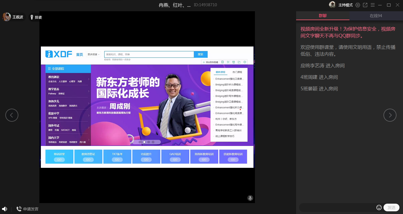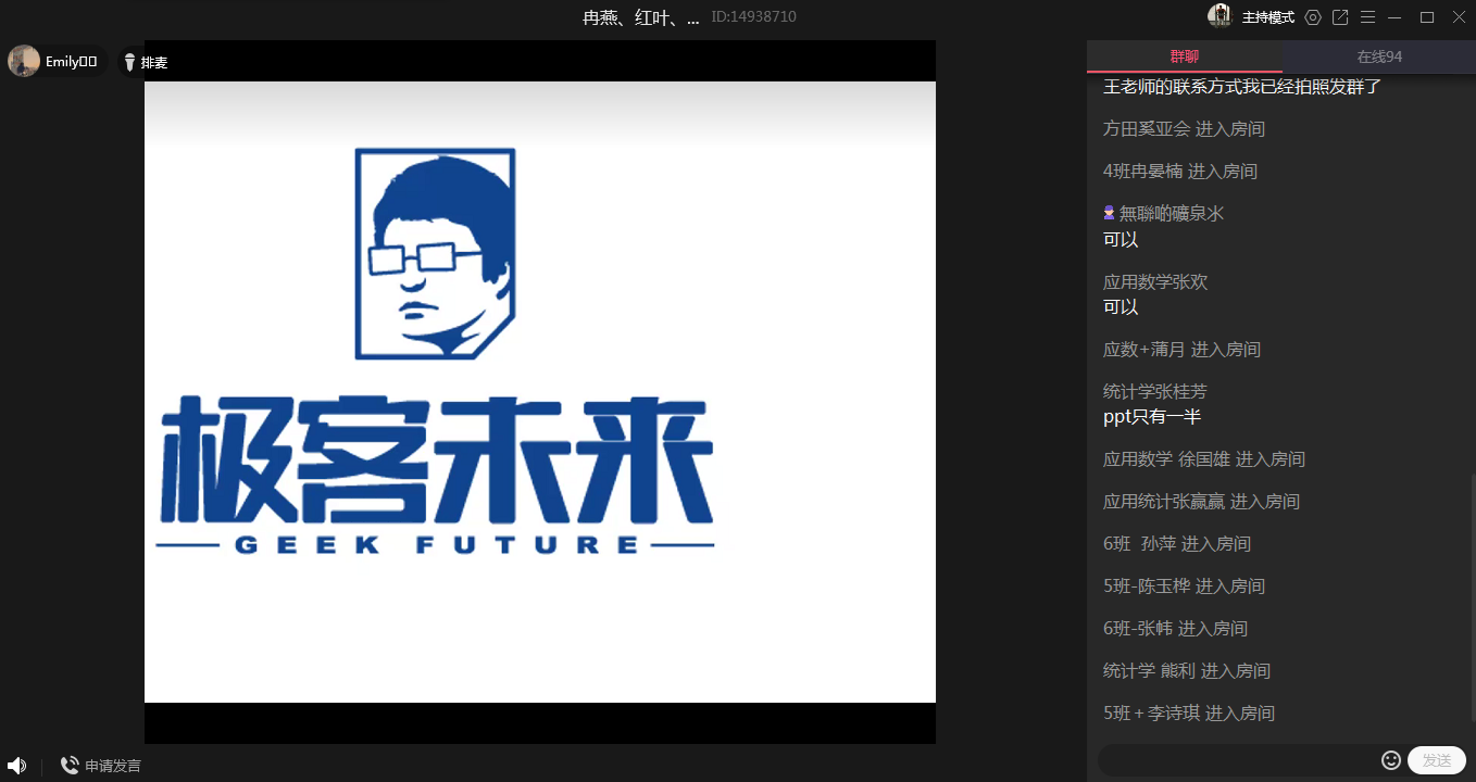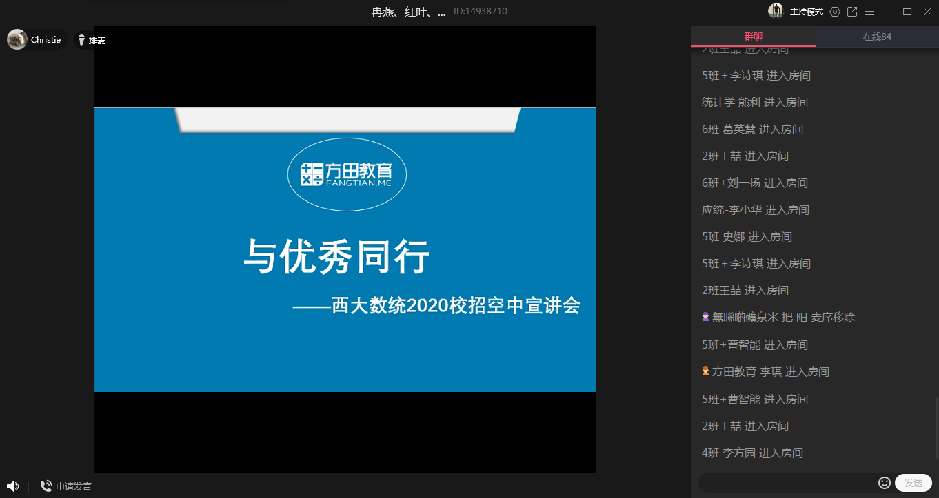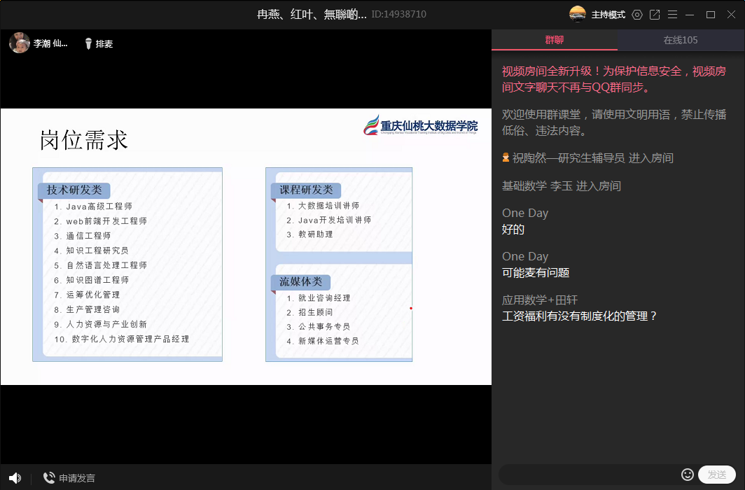 双选会于下午1点整正式开始,共有黄冈师范公司、巴川中学、重庆仙桃大数据公司、重庆新东方公司等9家用人单位和一百余名本科生、研究生参会,用人分别通过直播、PPT介绍、在线答疑等方式进行了招聘宣讲,数统院2020届毕业生辅导员唐海、祝陶然为用人单位详细介绍了公司的各方面情况,各毕业生就自己关心的问题进行了咨询提问,双选会网络会场氛围热烈、互动积极。