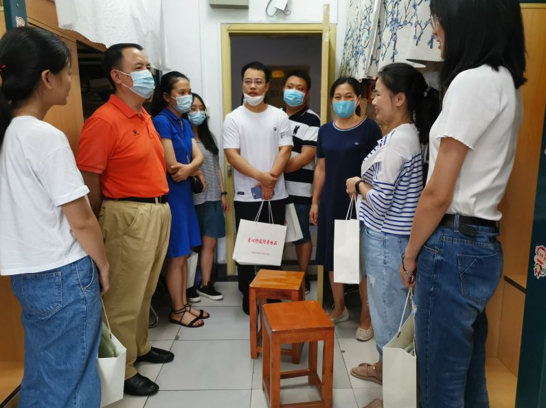 除了了解同学们的基本情况,易书记、田副书记还向同学们反复叮嘱了留校安全事宜,提醒同学们“勤洗手、多通风、不聚集,适当锻炼身体”,防疫意识不能松懈;不到河边、江边等危险地带,防汛意识牢记在心;注意暑期饮食安全,用电安全,过一个充实、健康的暑假。“你们有任何需要千万不要不好意思,要及时跟辅导员、跟公司联系,我们随时都能帮忙解决。祝大家暑期愉快。”在慰问的最后,易书记再次叮嘱员工照顾好自己,有任何问题及时与公司沟通。“没想到公司来了这么多老师看望我们,还给我们带来了爱心礼包,真是特别感谢老师们、感谢公司。” 收到防疫防暑物资和贴心问候的同学们都表示十分感动,“都放假了,为了我们老师还战斗在工作第一线,我们会谨记嘱咐,平平安安过暑假。”告别之前,留校员工向老师们承诺,一定好好照顾自己,把这个暑假过好,让留校生活更有意义。