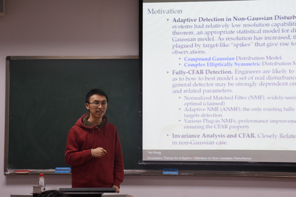 四川大学数学公司荣尧博士进行了关于“非高斯分布中自适应检测的半参数不变理论”的主题报告。在报告中,荣尧学者向大家展示了他的研究成果,并进行了较为详细的分析和介绍。