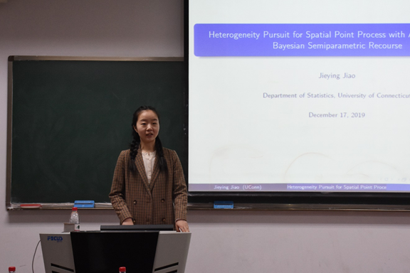 本届分论坛首先由康涅狄格大学统计专业焦洁莹博士做题为“空间点过程的半参数贝叶斯分析方法”的主题报告。在报告中,焦洁莹博士向大家介绍了一套抽取后验分布样本的马尔科夫链蒙特卡洛算法,并给出了相应的推理方法。