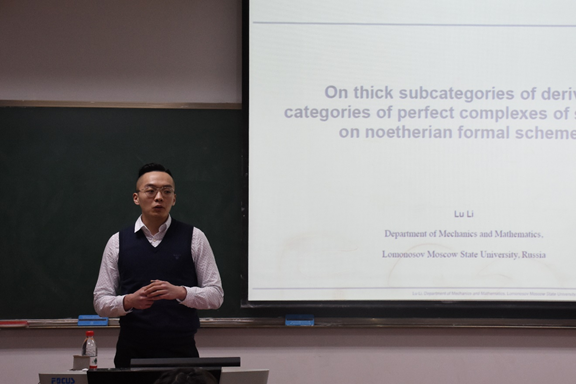 莫斯科大学数学力学系鲁澧博士做题为“Noetherian形式概形上的完美复形范畴的厚子范畴”的主题报告。在报告中,鲁澧博士向大家介绍了建立Noetherian形式概形X上的完美复形范畴的厚子范畴与X的特定化闭子集之间的一一对应关系。