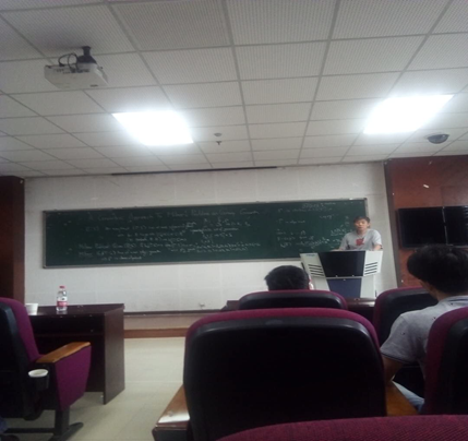 焦晓祥教授接着做了题为“Construction of conformal minimal two-spheres in quaternionic projection space by twistor map ”的报告。他介绍了国内外研究的现状及取得的主要成果,然后讨论了利用扭曲映射在四元射影空间中构建共形极小2维球面,涉及到调和序列和方程问题。