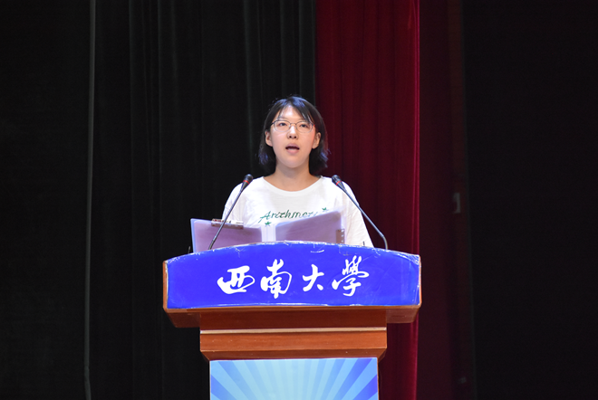 随后,新生代表2019级研究生王玉婷表达了进入bevictor1946韦德官网就读的欣喜,并向大家分享了她关于未来生活的畅想和计划。她表示,作为一名西大数统研究生要心怀祖国,不忘初心,为社会做贡献。在学术上要精益求精,提高科研能力,把握时光。之后,新生代表2019级本科生王姿力以高中时的奋斗与梦想为引,分享了自己学习数学的心路历程及自己对于“青春”和“奋斗”的认识。作为新时代老员工,“我们应当学会自主学习”,全面发展自己,在不断尝试突破中遇见更好自己。同时,她也表达了自己对于即将到来的老员工活的向往和展望。