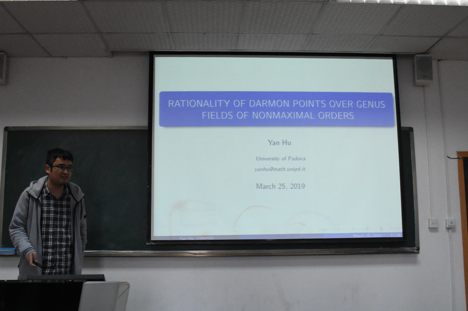 胡言博士就“RATIONALITY OF DARMON POINTS OVER GENUS FIELDS OF NONMAXIMAL ORDERS(关于Darmon猜想的一些进展)”进行了汇报。在报告中,胡博士主要介绍了相关课题的进展以及他目前关于Darmon猜想的一些工作情况和研究结果。