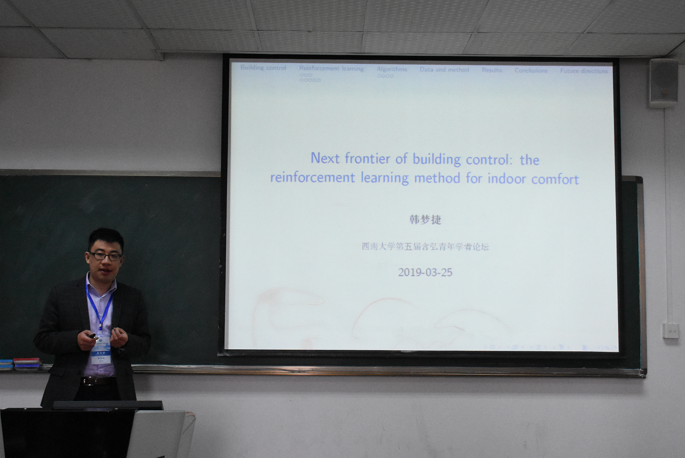 韩梦捷高级讲师就“A preliminary testing of a reinforcement learning control method for window opening and closing in an office building(关于强化学习控制策略在办公建筑开关窗中的应用研究)”进行了报告。在报告中,韩博士详细地为大家介绍了他所做试验的环境、过程、变量、实验数据和实验结果等。