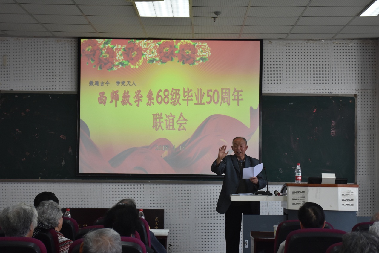 紧接着,退休老师赵宏量发言。他借自己为大家写的两首风趣的诗来表示自己对于蹉跎岁月的感慨。“今日古稀重相逢,笑问彼此谁是谁”。随后,他向大家简要介绍了他的作品和文章:关于十九大的心得体会,关于解释哥德巴赫猜想研究历程的文章,以及他最近三年写成的、目前正在刊印的《时间简史》读后感。最后,他谈到,大家回西大就和回家一样,容颜虽老,情谊犹在。并以一段散文朗诵结束发言,博得了大家的热烈掌声。