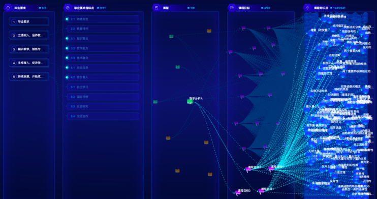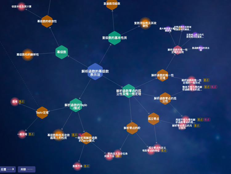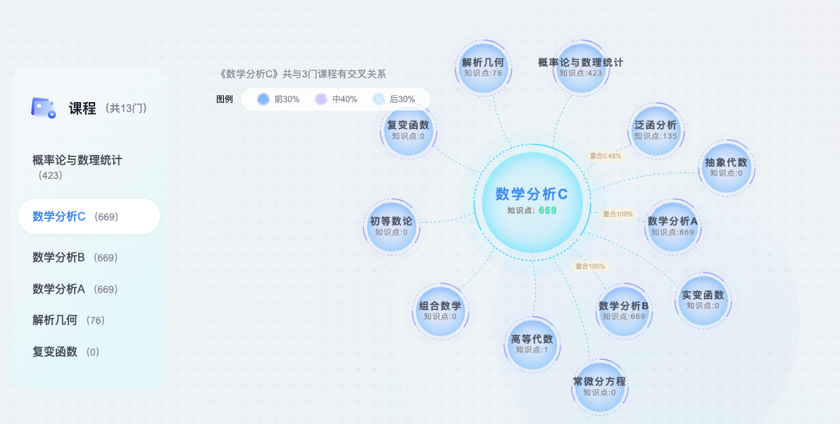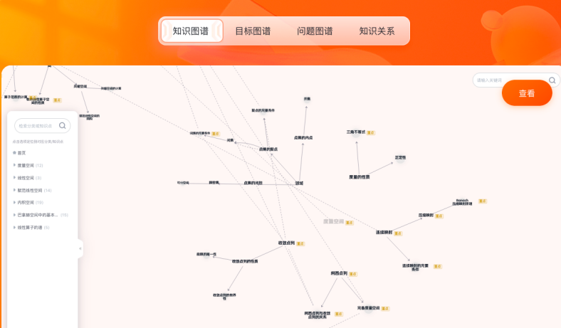 以《数学分析》《高等代数》《概率论与数理统计》等11门核心课程为基点,系统性构建多层级知识图谱体系,拆解2000余个知识点并精准标注逻辑关系,实现分析、代数、几何、方程、概率论等分支学科的跨学科关联网络可视化,让抽象数学知识直观可触。