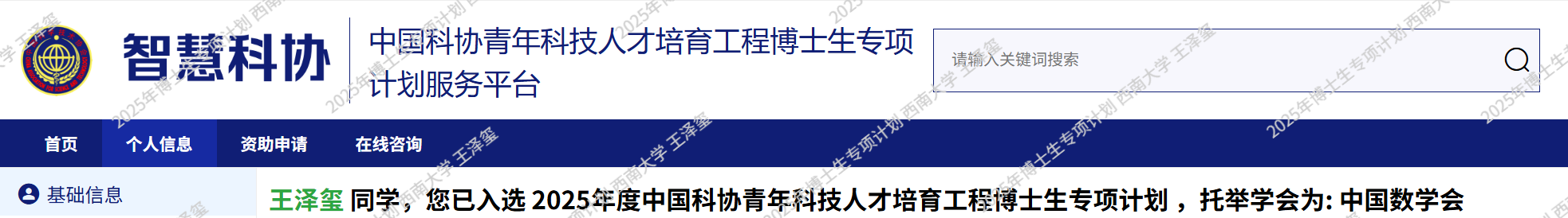 近日,公司2023级基础数学专业博士研究生王泽玺(导师:陈文晶教授)凭借扎实的学术功底与突出的科研潜力,成功入选2025年中国科协青年科技人才培育工程博士生专项计划。